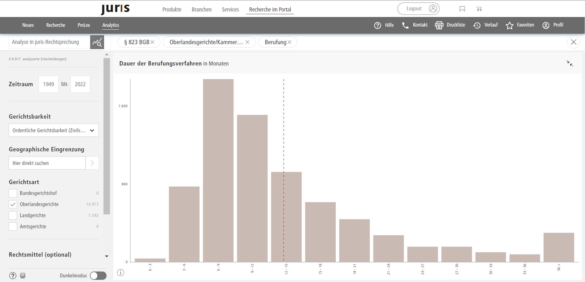 juris Analytics analysiert blitzschnell alle zu Ihren Suchbegriffen passenden Rechtsmittelverfahren und bereitet deren durchschnittliche Dauer übersichtlich auf.